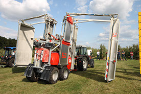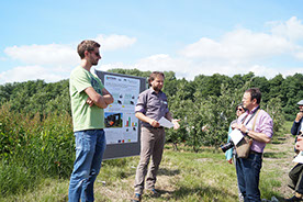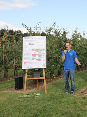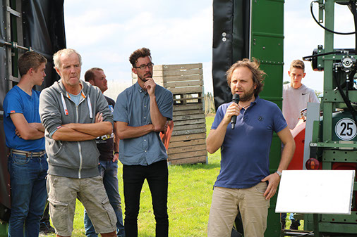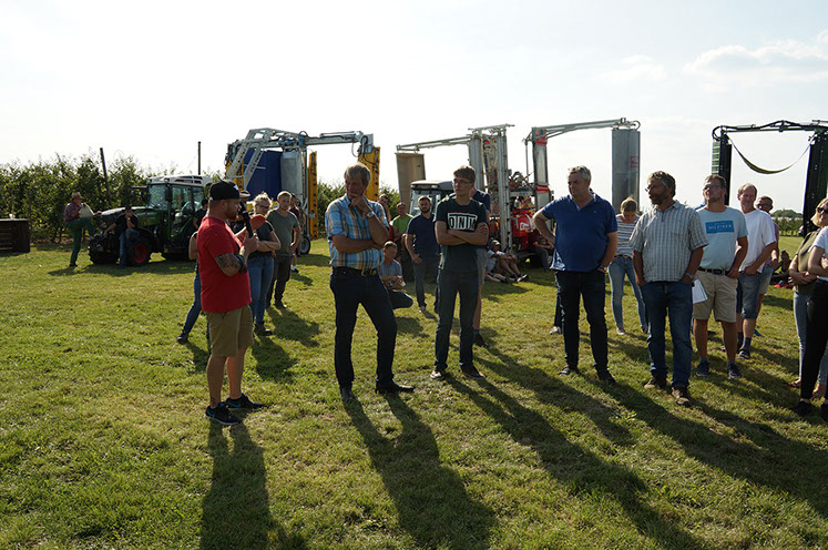 Erstmalig im Jahr 2020 fanden anstatt der üblichen Vorernteführungen gezielte Thementage seitens der ESTEBURG statt. Während der Technik-Tage am 21. & 22. Juli galt neben mechanischer Entblätterung und nicht-chemischer Beikrautregulierung je ein Teil der Veranstaltungen der Umsetzung der ALVO. Neben der Vorstellung von drei tunnelartigen Sprühgeräten mit besonderen Verwendungsbestimmungen im Geltungsbereich der ALVO, lag der Fokus vor allem auf der Präsentation von knapp dreijährigen Versuchsergebnissen, die im Rahmen des begleitenden Projekts ALVOTECH- TRANSFER erarbeitet wurden. Ergebnisse aus drei Versuchsjahren sowohl in der Integrierten Produktion, wie auch in der ökologischen Produktion (OKO), präsentierte Jonas Huhs. Im Anschluss wurden die Aussagen durch Niklas Oeser mit Blick auf zweijährige Versuche auf einem IP-Betrieb, wie auch auf OKO-Betrieben, ergänzt. Am zweiten Tag standen die Betriebsleiter Dirk Quast, Gert Hauschildt und Benjamin Riemann den Teilnehmern Rede und Antwort und konnten von ihren zweijährigen Erfahrungen mit tunnelartigen Sprühgeräten im Praxiseinsatz berichten.